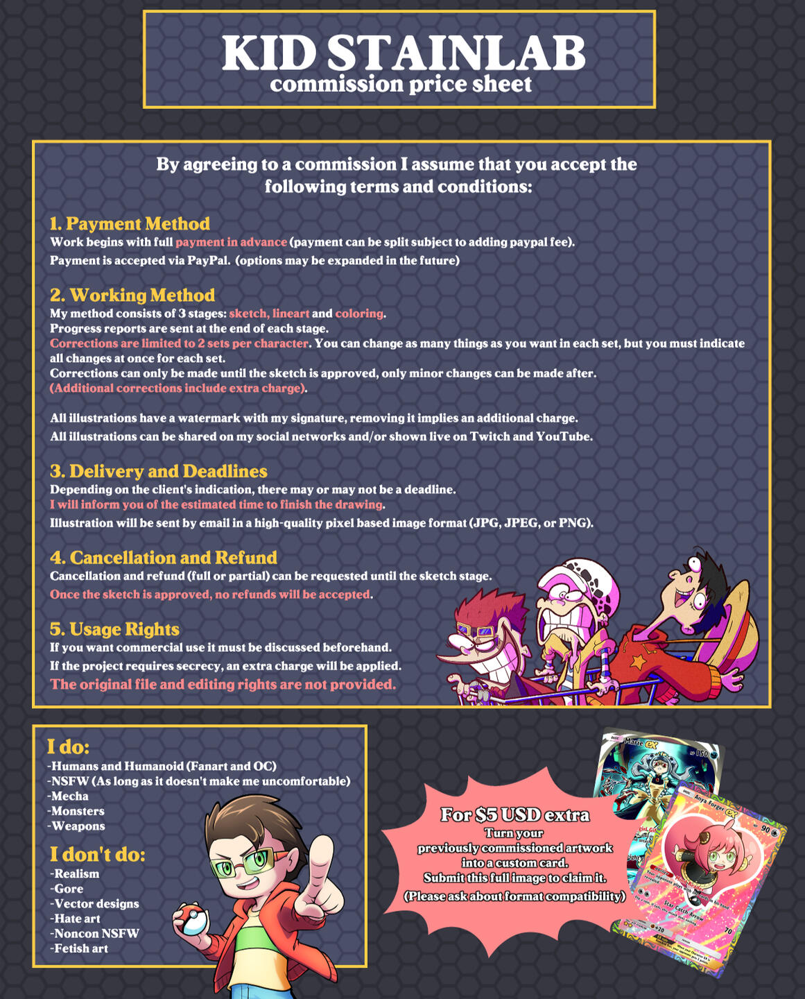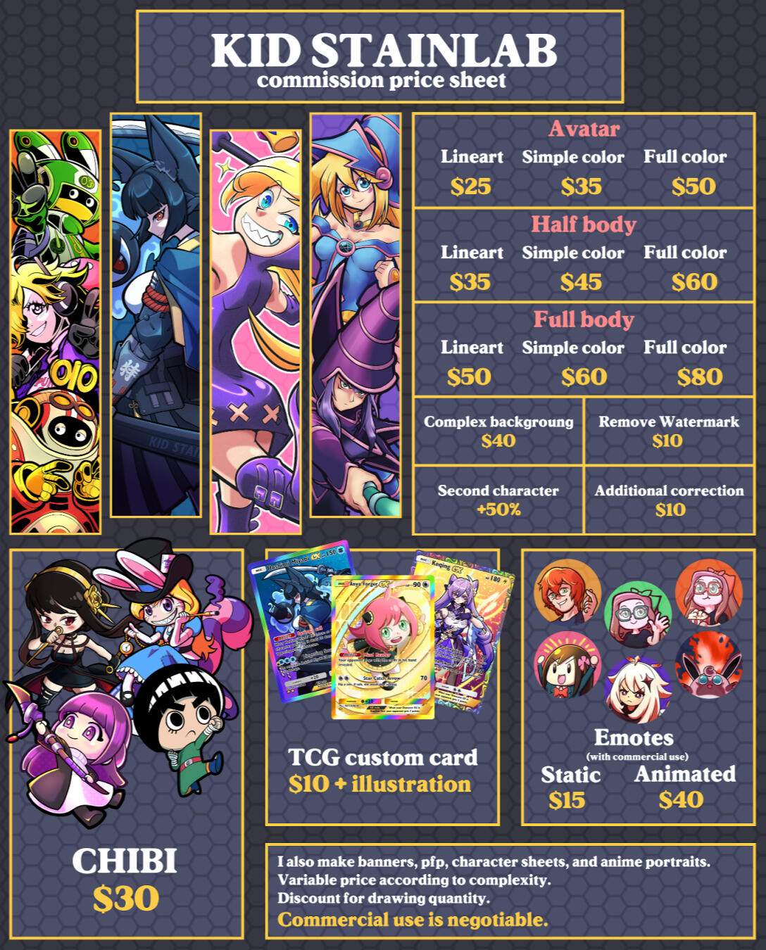 Hello! I'm Kid Stainlab, a chilean freelance digital illustrator. I have experience in anime-style character design, portraits in different styles, chibi, emotes, banners, and logos.